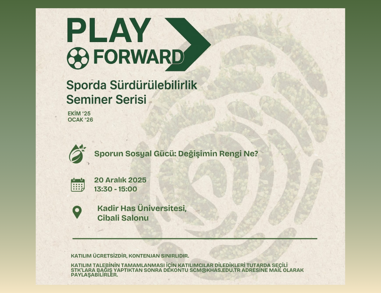 Sporun toplumsal dönüşümdeki rolünün eşitlik ve kapsayıcılık perspektifiyle ele alınacağı “Sporun Sosyal Gücü, Değişimin Rengi Ne?” başlıklı etkinlik Play Forward: Sporda Sürdürülebilirlik Seminer Serisi’nin üçüncü oturumu olacak. Kadir Has Üniversitesi’nin Cibali Kampüsünde 20 Aralık Cumartesi günü gerçekleşecek etkinliğin kayıtları devam ediyor.