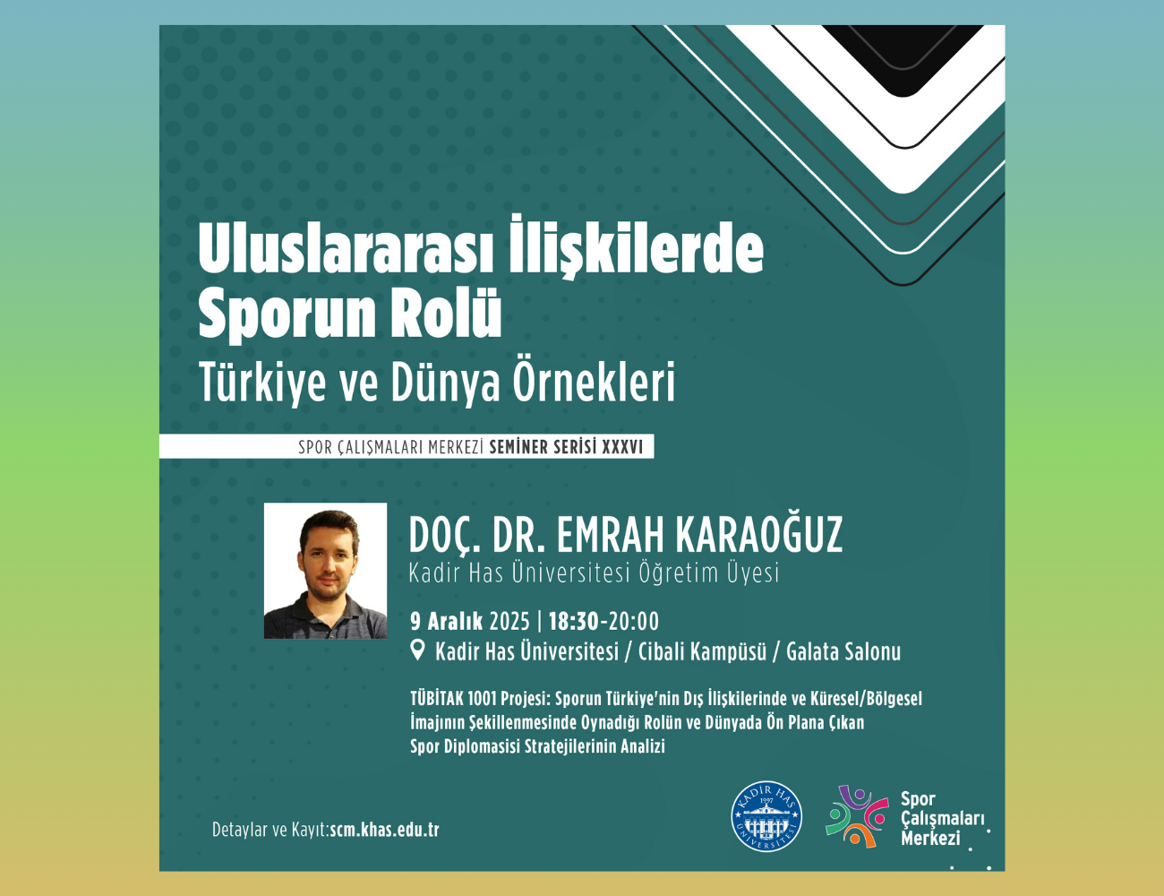 Spor Çalışmaları Merkezi Seminer Serisi 36. etkinliği ile devam ediyor. Doç. Dr. Emrah Karaoğuz’un konuşmacı olacağı “Uluslararası İlişkilerde Sporun Rolü” başlıklı seminer 9 Aralık Salı günü gerçekleşecek.